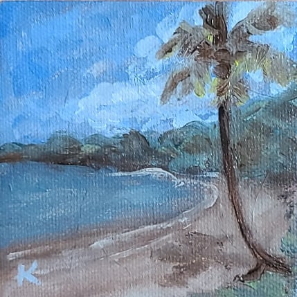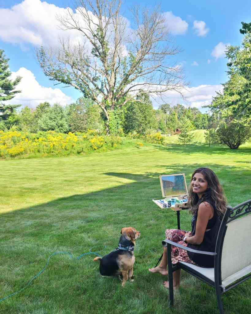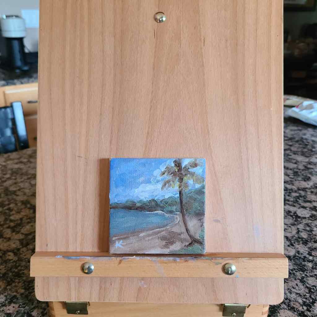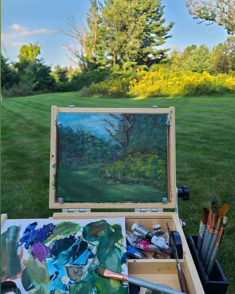 I was very excited today to try out my new ‘pochade box’ for painting ‘en plein air’ (outdoors). I’m looking forward to bringing it on my travels. I love that I have to paint kind of faster and looser than I normally would. I’d love to keep loosening up the brush strokes and get more impressionistic or even abstract over time. Today’s painting was made with a limited palette of burnt umber, phthalo blue, cadmium yellow, permanent rose, and titanium white.